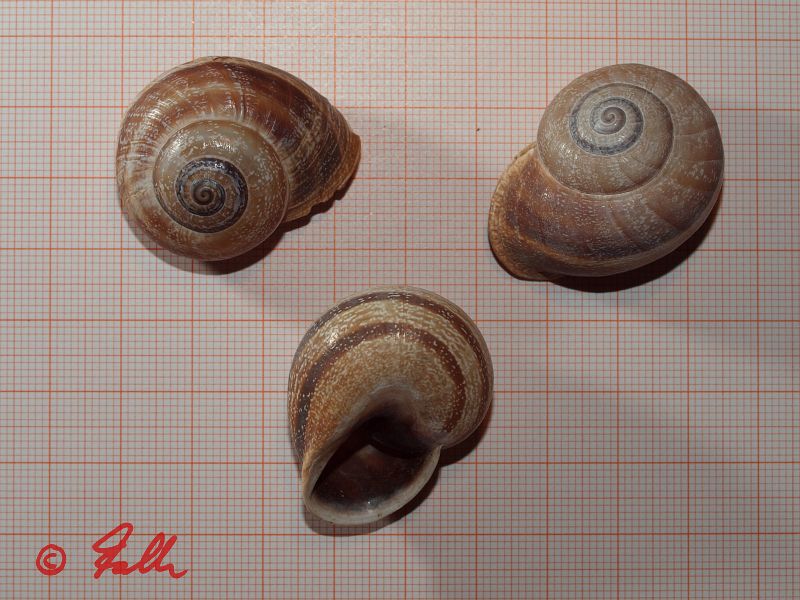 ![]() Die Spanische Feldschnecke (Otala punctata) hat ebenda eine weite Verbreitung. Außer im Gelände findet man sie natürlich auch in der örtlichen Gastronomie. Die abgebildeten Gehäuse sind allerdings nicht aus einem Eintopf, sondern im Felde aufgelesen; sie zeigen voll ausgebildete und typische Exemplare. Millimeterpapier. [ Loc: Loscos (Teruel), Aragón] Hier ein Photo mit Beispielen für Exemplare von N Valencia, die etwas größer und stärker gebändert sind. |