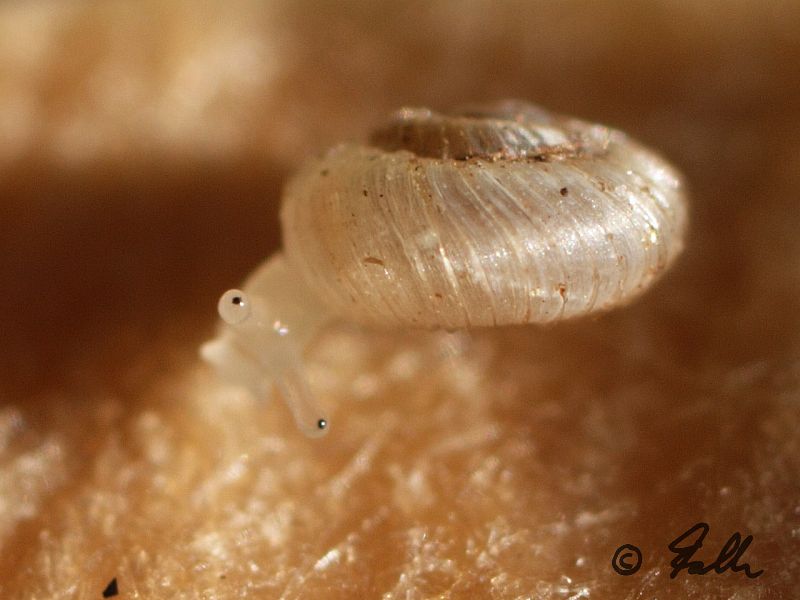 Leere Gehäuse von Phenacolimax (Ph.) major, li.Abb. hauptsächlich ventral, re.Abb. apical; das größte Gehäuse hat eine Breite von 7mm; maximal 2½ Windungen sind ausgebildet; ein "Hautumschlag" ist nur angedeutet vorhanden oder fehlt. [35mm Macro] |