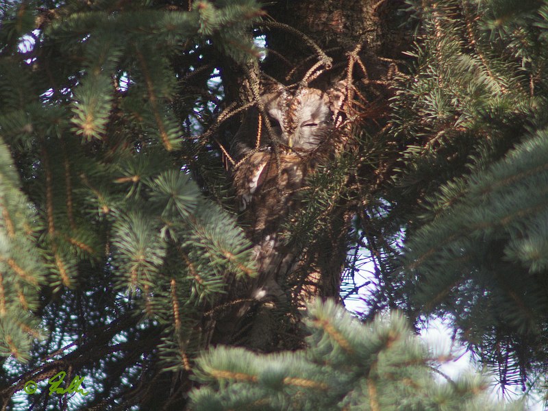 Am letzen Wochenende konnte ich einen Waldkautz (Stix aluco) in seiner Wohnhöle ablichten, wo er vergeblich versuchte, da schwer unter der brütenden Sommerhitze leidend, den Tag zu verschlafen. Man beachte die gute Tarnung ...