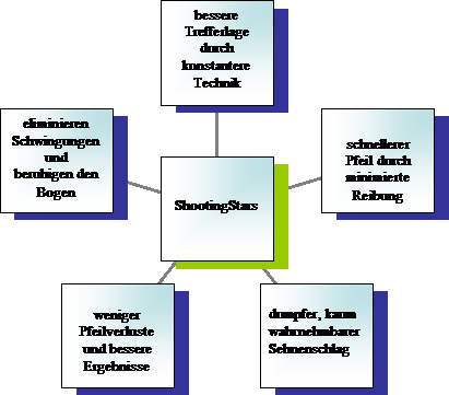 Das ShootingStar-Design ist inspiriert vom leider schon lange nicht mehr erhältlichen R.E. STINSON Silencer aus den 1960er Jahren. Trotzdem stellen Form sowie Herstellungsprozeß und insbesondere die ausschließliche Verwendung von Recycling-Material eine völlig eigenständige Entwicklung dar. Die Testphase der ShootingStars begann Ende 2004 und die ersten Exemplare litten etwas an wenig dauerhaften Verbindungen, da selbst die damals verwandte Vulkanisierflüssigkeit recycelt war! Mittlerweile überdauern ShootingStars einige hundert Schuß auf den Sehnen von zugstarken Jagdbogen, bevor sie ausgetauscht werden müssen. Je nachdem, ob eine hohe Dämpfung oder eher eine sehr schnelle Sehne gewünscht bzw. notwendig ist, kann der grundsätzlich als sechsarmiger Stern produzierte ShootingStar an die eigenen Bedürfnisse angepaßt werden. Mit Hilfe einer Schere trimmt man die Arme etwas oder entfernt sie komplett an ihrer Basis (s. nebenstehende Abb.). Um die bestmögliche Dämpfung zu erzielen wird man den ShootingStar aber in seiner vollen Größe belassen. Ein sechsarmiger ShootingStar wiegt im Durchschnitt 29 grain. Standardmäßig werden zwei ShootingStars auf der Sehne plaziert. Da sie sich problemlos verschieben lassen ist es so möglich, durch einfaches Ausprobieren, die Positionen der größten Schwingungsamplituden in der Sehne herauszufinden. Hier angebracht, entfalten die ShootingStars ihre größte Wirkung. Die dreiarmige Konfiguration ist gewöhnlich für eine deutliche Geräuschminderung ausreichend und ergibt selbstverständlich einen schnelleren Pfeilflug, da die Masse eines dreiarmigen ShootingStar nur etwa 19 grain beträgt. |